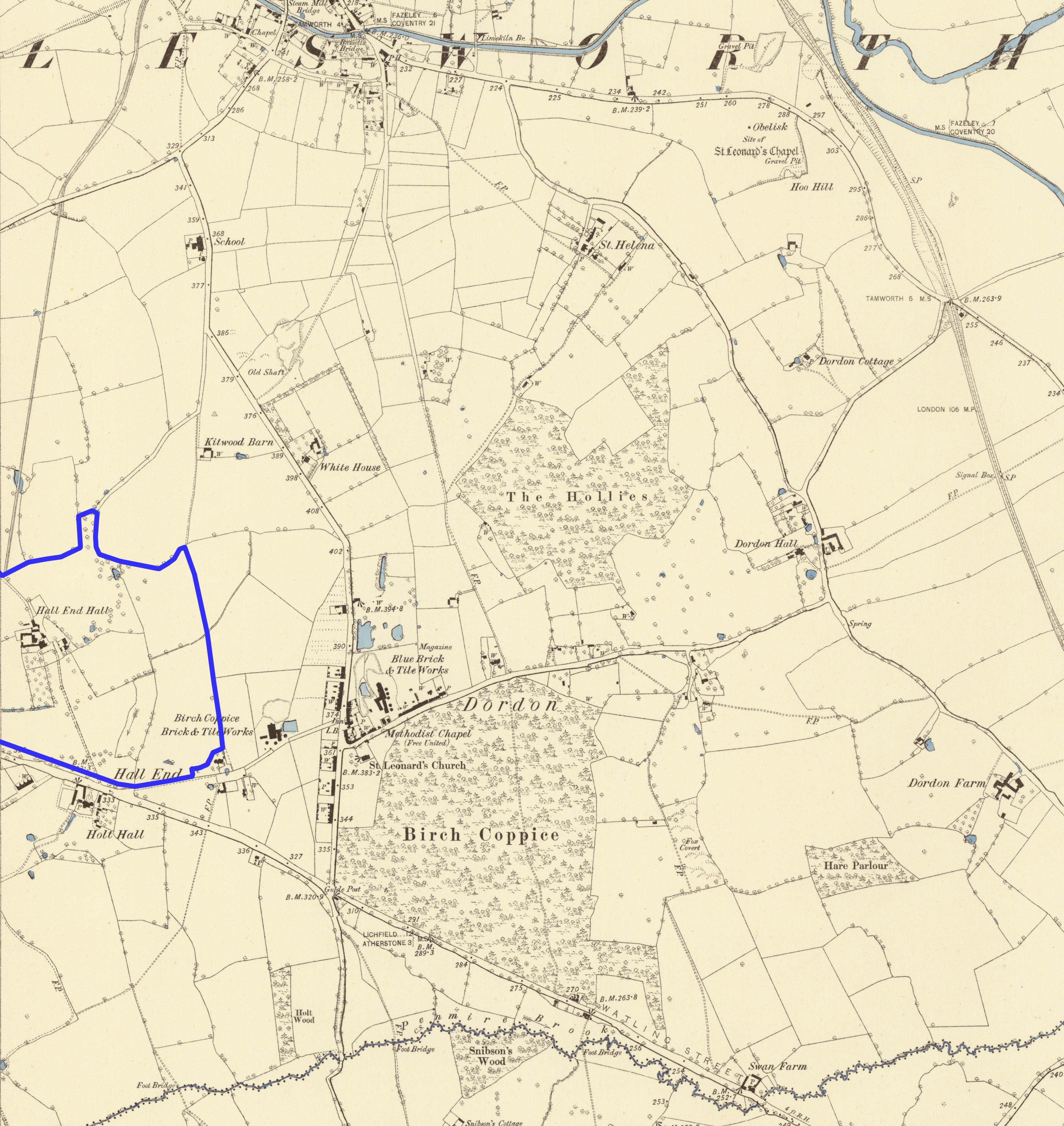 Ordnance Survey Warwickshire VI.NW (includes: Baddesley Ensor; Dordon; Grendon; Polesworth) – 1885 OS Map – with Blue Line Site Boundary Overlay